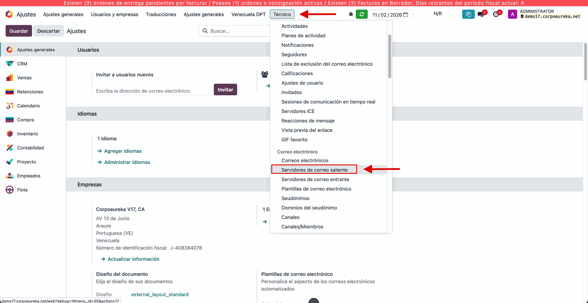 Paso 4: Una vez en "Ajustes" ingresa a "Técnico" y luego a "Servidores de Correo saliente"