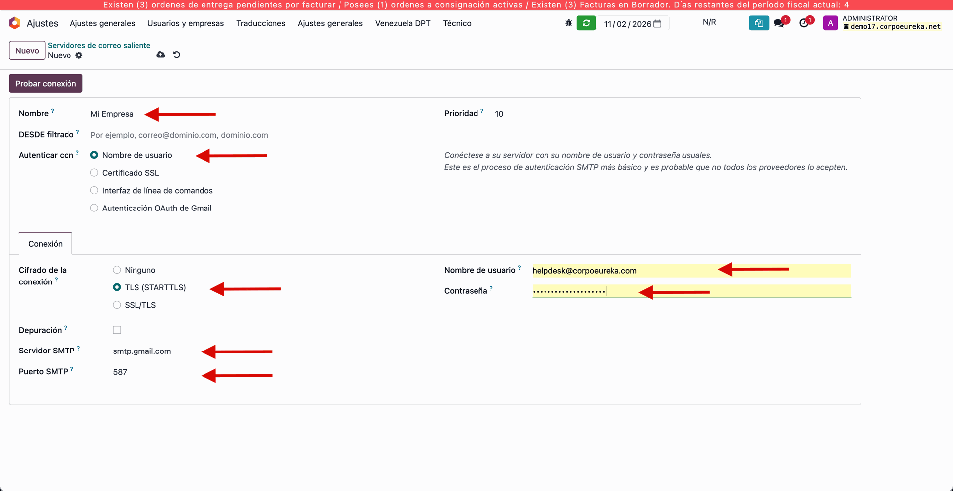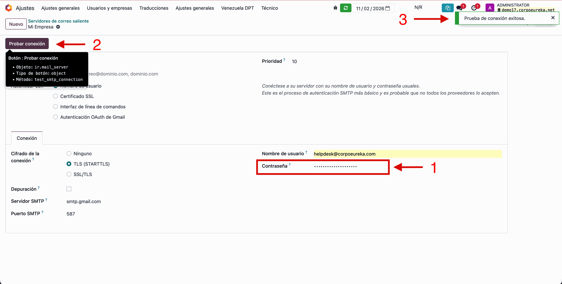 Paso 7: La contraseña que usaremos para el servidor de correo sera la Apikey que creamos al inicio del manual, Luego Probamos conexión y esperamos que el sistema nos responda con un mensaje de "Prueba de conexión exitosa"